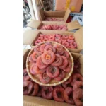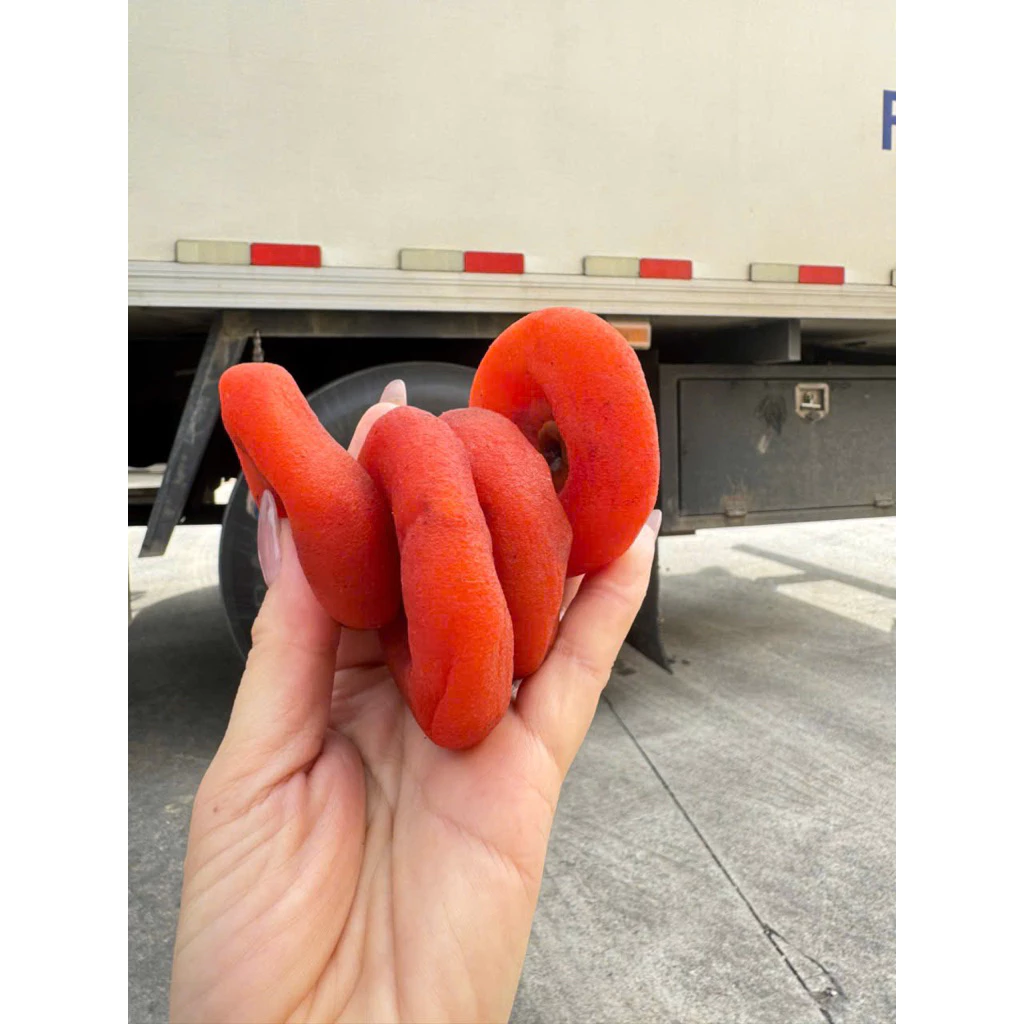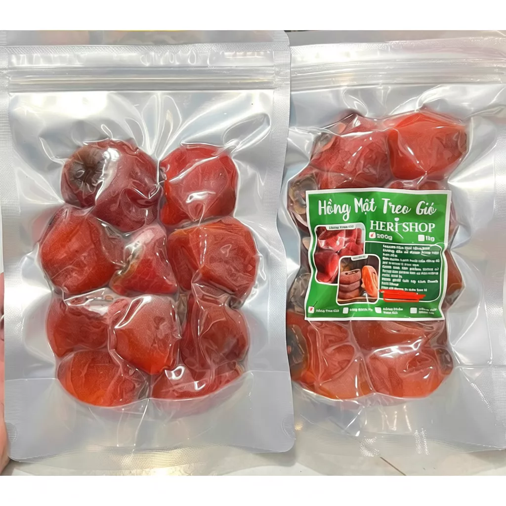 Hồng bánh xe có lớp phấn trắng tự nhiên phủ bên ngoài – đây là hiện tượng hình thành trong quá trình chế biến từ quả hồng tươi, giúp sản phẩm giữ được độ dai dẻo ổn định và hương vị tự nhiên.