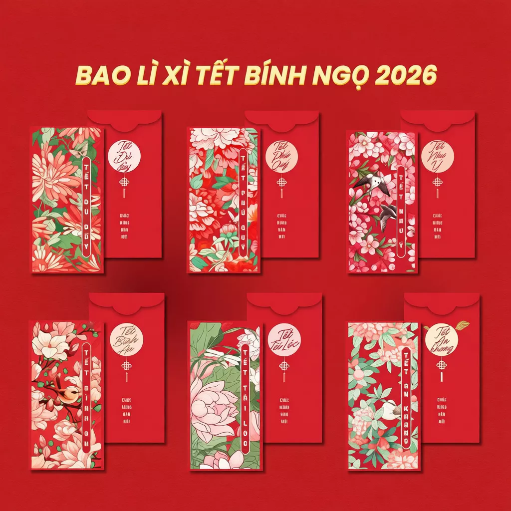 🌟 Điểm nổi bật của sản phẩm 🌟 – Thiết kế đẹp mắt: Bao lì xì Tết 2026 với các mẫu thiết kế độc đáo như Hoa Sen, Hoa Lá Bốn Mùa, và Tết Hoa Nhí, mang đến sự tinh tế và truyền thống. – Chất liệu giấy C150 cao cấp: Giấy dày, cán màng mờ, giúp bảo vệ phong bao khỏi trầy xước và tăng độ bền. – Kích thước phù hợp: Kích thước 16×8 cm, nắp 1.5 cm, đựng vừa tờ 500k đứng, rất tiện lợi. 🎨 Các biến thể có sẵn 🎨 – BLX Hoa Sen: Set 12 cái – BLX Hoa Lá Bốn Mùa: Set 48 cái – BLX Tết Hoa Nhí: Set 48 cái – BLX Tết Trọn: Set 12 cái – BLX Tết Độc Lập: Set 48 cái 📦 Thông tin bổ sung 📦 – Sản phẩm có sẵn trong nhiều biến thể để phù hợp với nhu cầu của bạn. – Mỗi set bao gồm 12 hoặc 48 cái, tùy chọn theo yêu cầu. Chọn bao lì xì Tết 2026 để mang lại may mắn và tài lộc cho mọi người trong gia đình và bạn bè của bạn!